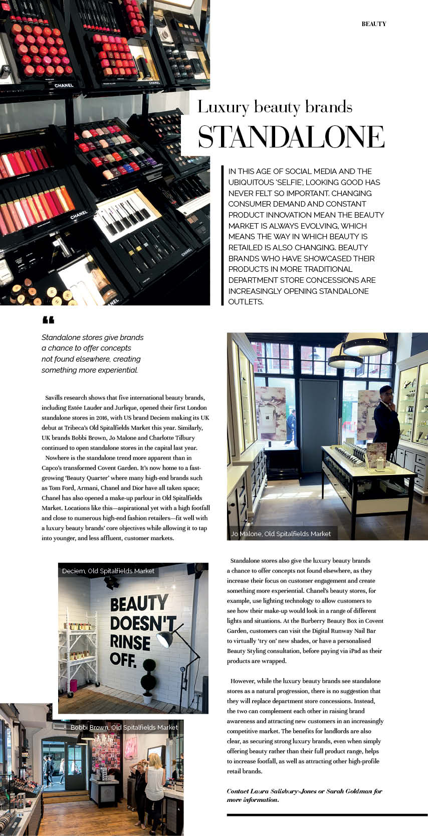 Savills research shows that five international beauty brands, including Estée Lauder and Jurlique, opened their first London standalone stores in 2016, with US brand Deciem making its UK debut at Tribeca’s Old Spitalfields Market this year. Similarly, UK brands Bobbi Brown, Jo Malone and Charlotte Tilbury continued to open standalone stores in the capital last year. Nowhere is the standalone trend more apparent than in Capco’s transformed Covent Garden. It’s now home to a fast-growing ‘Beauty Quarter’ where many high-end brands such as Tom Ford, Armani, Chanel and Dior have all taken space; Chanel has also opened a make-up parlour in Old Spitalfields Market. Locations like this—aspirational yet with a high footfall and close to numerous high-end fashion retailers—fit well with a luxury beauty brands’ core objectives while allowing it to tap into younger, and less affluent, customer markets.