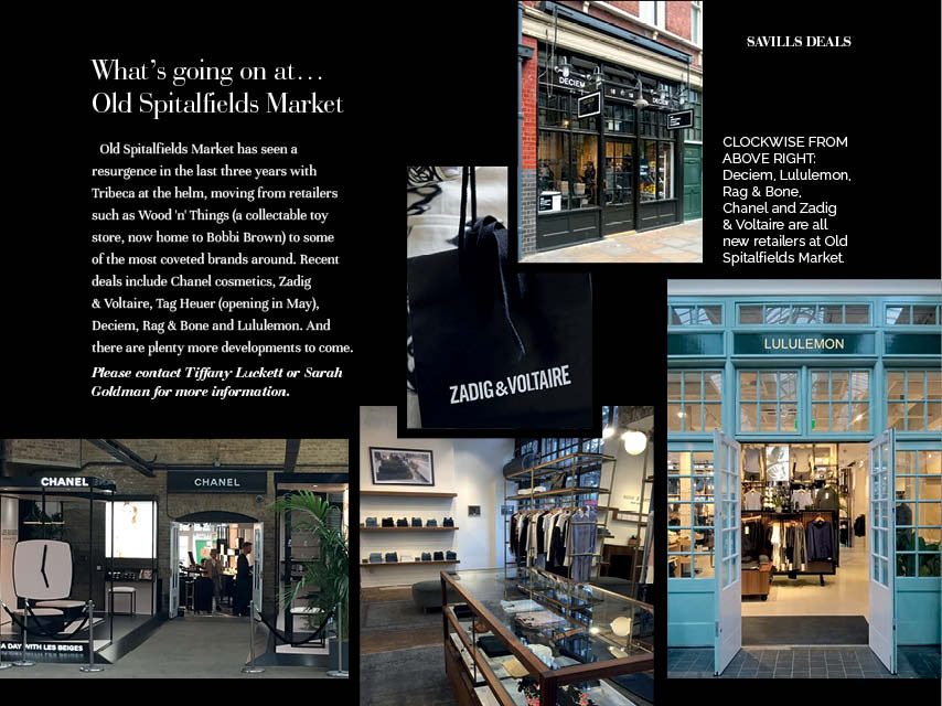 Old Spitalfields Market has seen a resurgence in the last three years with Tribeca at the helm, moving from retailers such as Wood 'n' Things (a collectable toy store, now home to Bobbi Brown) to some of the most coveted brands around. Recent deals include Chanel cosmetics, Zadig & Voltaire, Tag Heuer (opening in May), Deciem, Rag & Bone and Lululemon. And there are plenty more developments to come